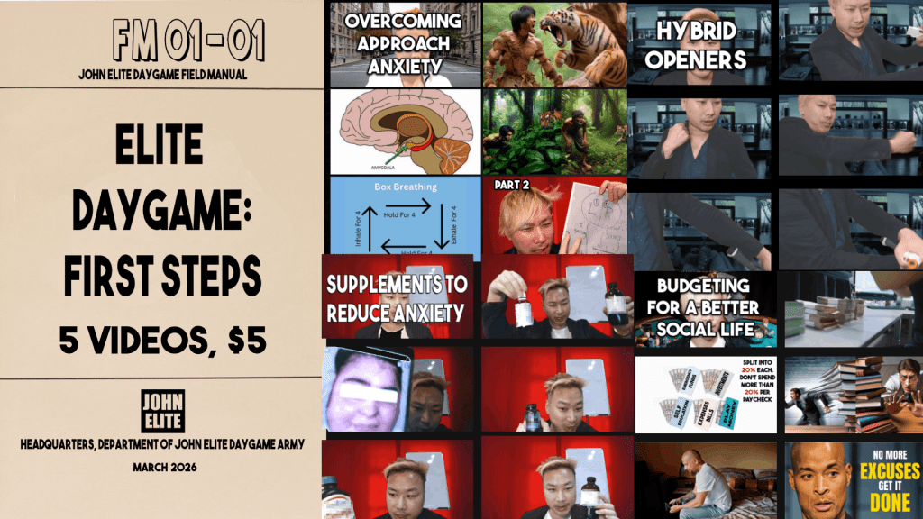 I’m John Elite. For over 24 years, I’ve been doing daygame, 13 years teaching daygame students, and obsessing over field testing and split testing over what separates those who succeed from those who don’t.