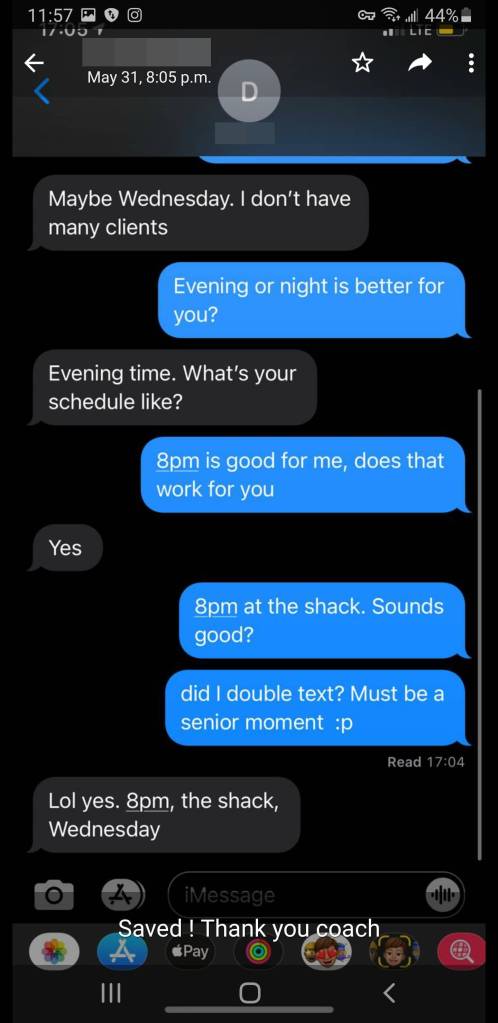 I didn’t show the entire conversation, but he just copied and pasted what I told him to text. He doubled texted her by accident. So I told him how to fix it with the senior moment thing…