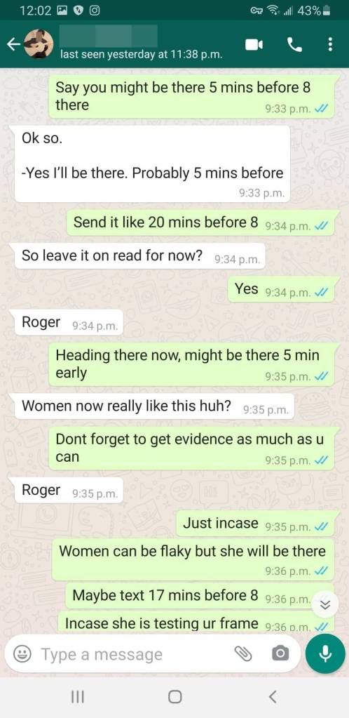 OVER HERE, HE WAS ASKING IF HE SHOULD SEND A CONFIRMATION TEXT…. IF YOU SENT IT TOO EARLY SHE WILL HAVE THE CHANCE TO FLAKE SINCE SHE SEEN SO MANY OTHER GUYS SENDING THE SAME TEXT. EVEN IF SHE LIKED YOU, SHE WILL FLAKE… SO I MADE IT 17 MINS BEFORE THE DATE START SO SHE WILL HAVE TO BE FORCED TO CHANGE, FEEL OBLIGATED, WHICH WILL HELP MY STUDENT PULL FASTER… DUE TO HER GUILT