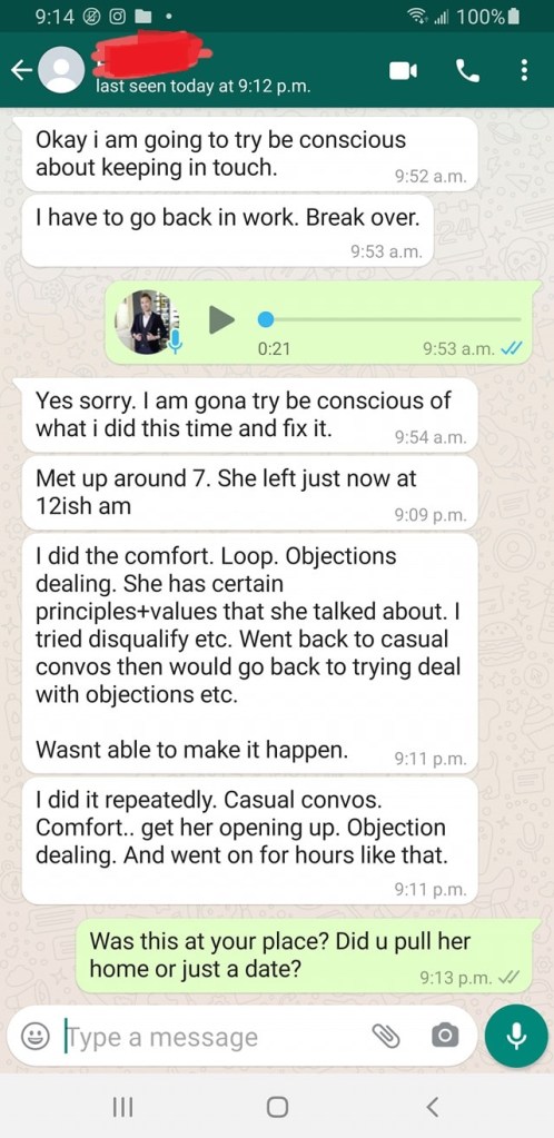 Now he will text her, dude is like cockblocking himself. At this point the objections is dealt with, just focus on the logistics, maneuver…