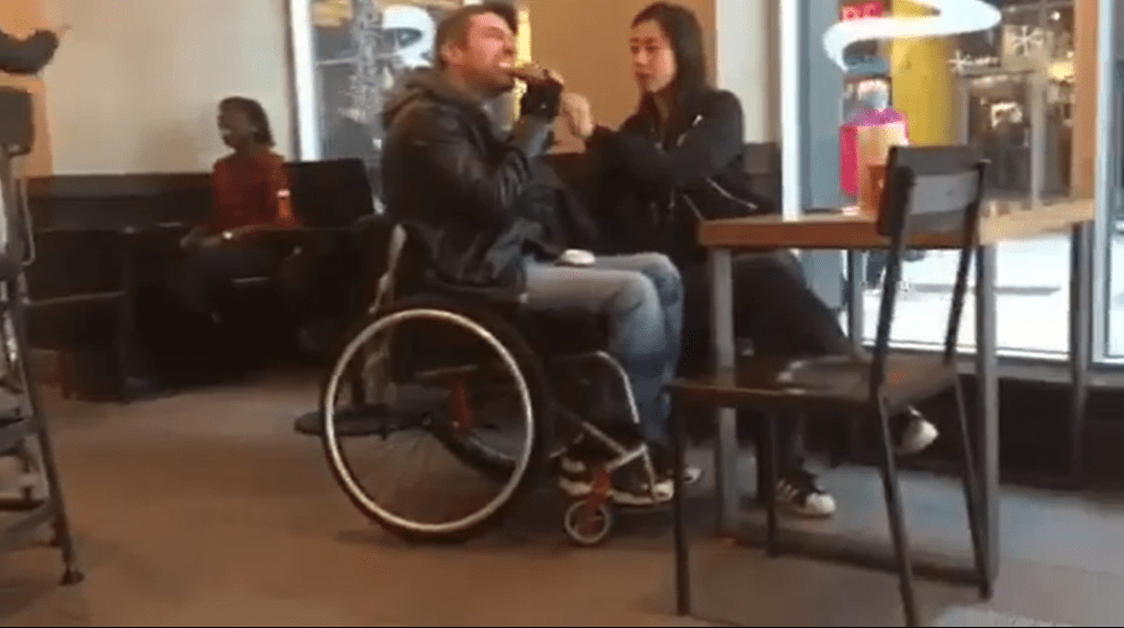 I DIDN’T TAKE THIS PICTURE, BUT THIS CREEPY FUCK KNAWING AT PIZZA IN VANCOUVER WITH A HOT ASIAN GIRLFRIEND… THEY ARE A COUPLE, CAN’T EVEN MAKE THIS SHIT UP.. HE HAS NO FUCKING WORKING LEGS… I’M JUST SAYING… DON’T CALL ME RACIST FOR POINTING THIS OUT, THE ONLY RACIST PERSON IS HER…. SHE HATES ASIAN MEN..