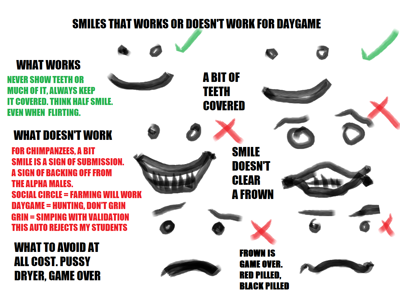 - NEVER SMILE, IF NOT IN A SOCIAL CIRCLE. ONLY HALF SMILE, OR SMIRK. OR HAVE AN ALPHA SCOWL.. BUT NEVER IN YOUR LIFETIME HAVE A BIG BETA SMILE.