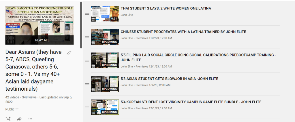 John Elite is a man of focus, sheer will. One time his 5’7 Chinese student got 7 lays (soon) 3 models 2 white girls one 19 year old girlfriend…