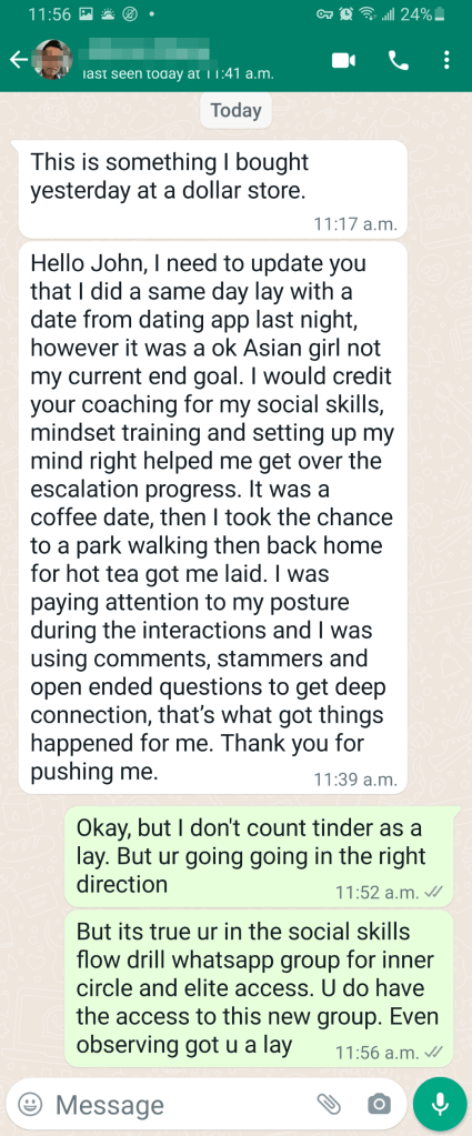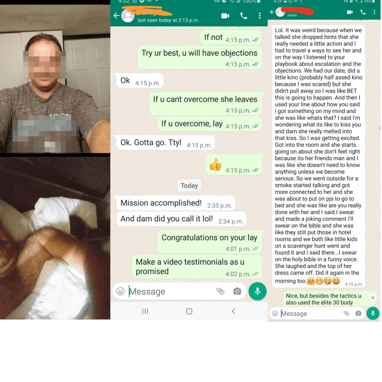 THE OTHER GUYS WHO CAN’T AFFORD IT BUT STILL FOUND A WAY TO RAISE THE MONEY. THEN HE INVESTED IN HIMSELF. HE GOT LAID IN 3 DAYS. WHILE I DON’T COUNTER TINDER LIKE SELF PROCLAIMED HIGH LAYCOUNTS GUY. STILL IT SHOWS HIM BY USING WHAT HE LEARNED ON THE DATE. HE IS IN THE INNER CIRCLE AND THE ELITE ACCESS WHATSAPP GROUP, A NEW ONE, HE GOT LAID BY USING THE PARTS OF THE SOCIAL SKILLS FLOW DRILL. PLUS THE SKYPES I GAVE HIM ONCE IN A WHILE.