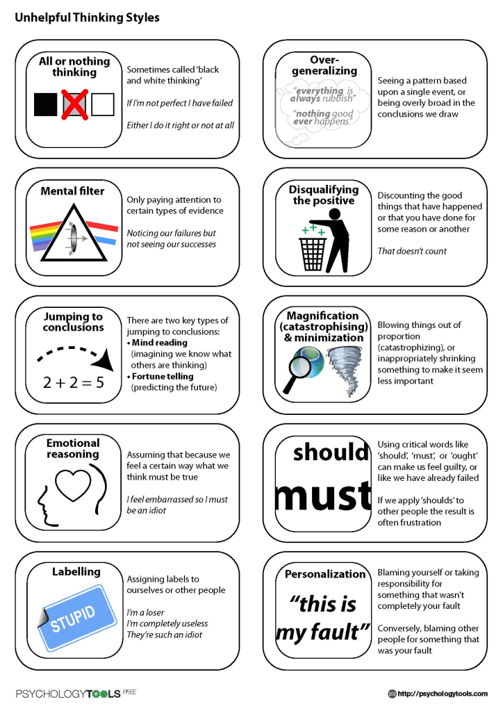All or nothing thinking its all false because some mental nonsense. Or overgeneralization. Mental filtering. Disqualifying the positives. Jumping to conclusions. Emotional reasoning with no proof. Shoulds and must.