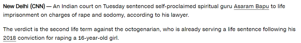 An Indian court on Tuesday sentenced self-proclaimed spiritual guru Asaram Bapu to life imprisonment on charges of rape and sodomy, according to his lawyer.