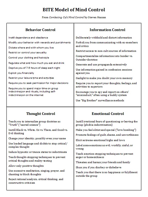That was the B.I.T.E model for cults and I even applied it to see my own business, its only 10% cult like, but its not at all.