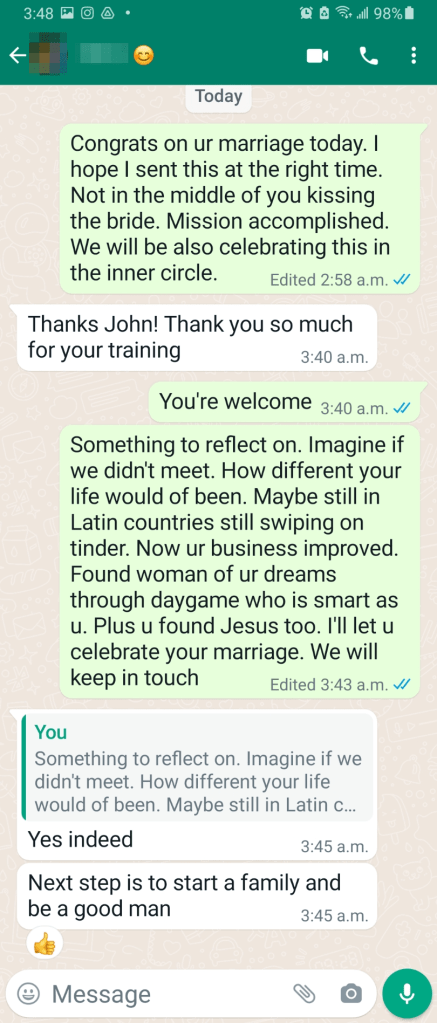 Yes, you heard that right! That resilient, fast adapting daygamer is walking down the aisle, and it’s all thanks to our unique mentorship journey.