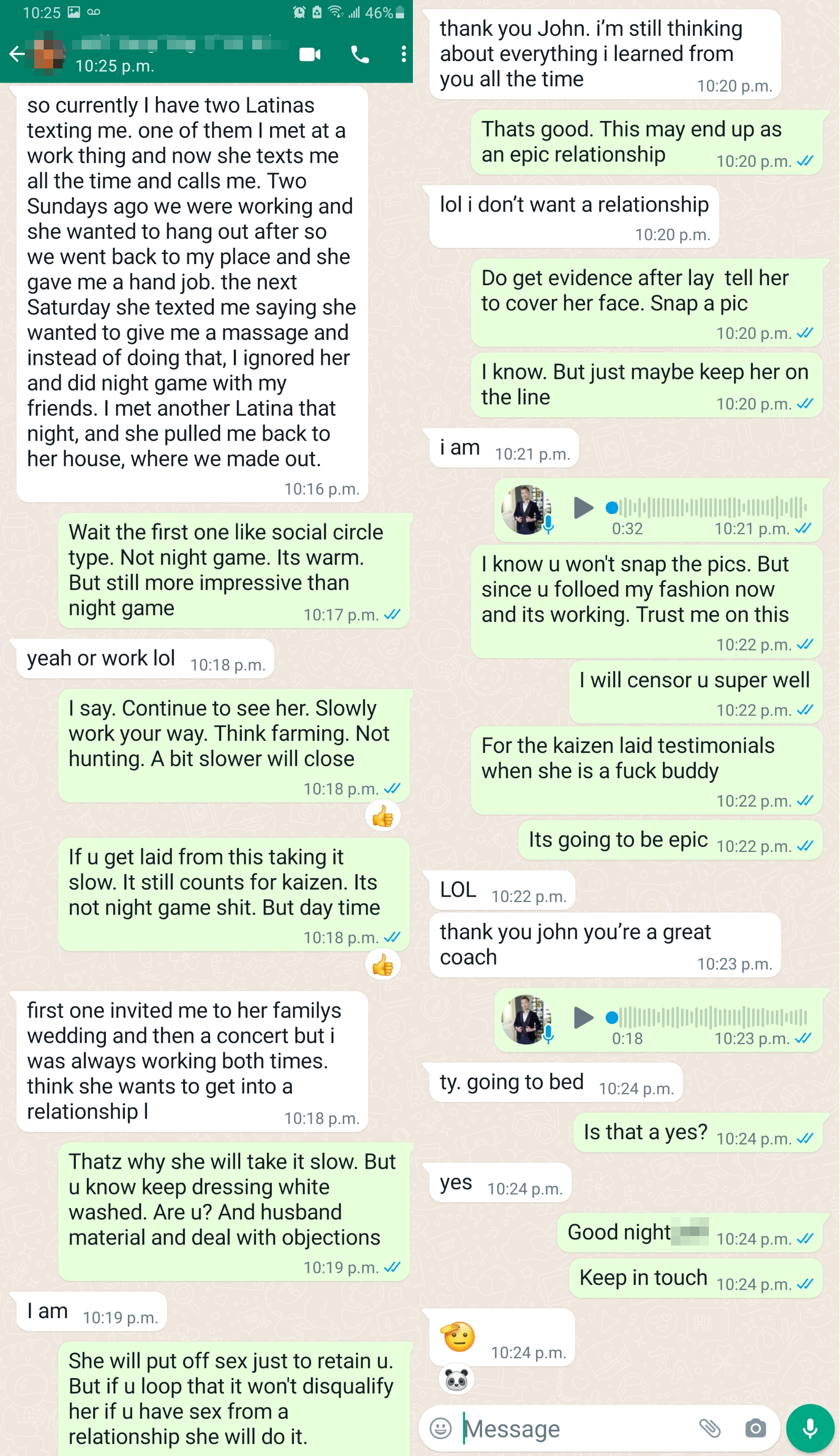 This white student got laid in 3 approaches that day using my ninja game for Elite 30 and I gave him some tips. He was in an upward spiral being tall white, good looking. But results took a long time. However he was in more of an upwards spiral when I trained him. So he takes more risk compared to the half Latino former student.