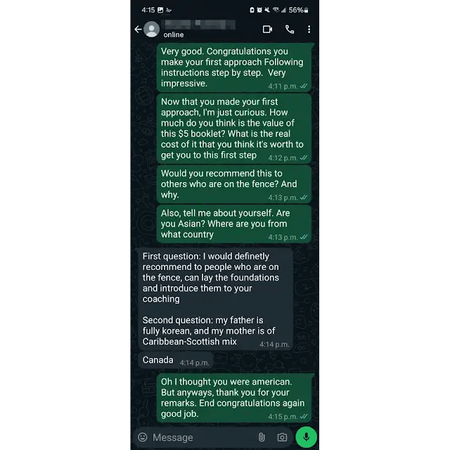 This is an Indian from Ontario for this screenshot. He made a lot of excuses at first and has super ADHD like most Indians. However, as I kept telling him, he could do it if he stopped making excuses. At first, he approached in a random bus stop without following instructions as women weren’t moving. Later on, he went through the entire course in detail with all his focus. Then he did it. This is what he said, “Hello John, this is late as hell, but I made 2 approaches today. I did the box breathing. And then 70% approach 10 times. Then approached one Asian, and shortly after a white girl.” When I asked him how much this booklet should be worth, he said it was worth $60. Maybe I should raise the price.