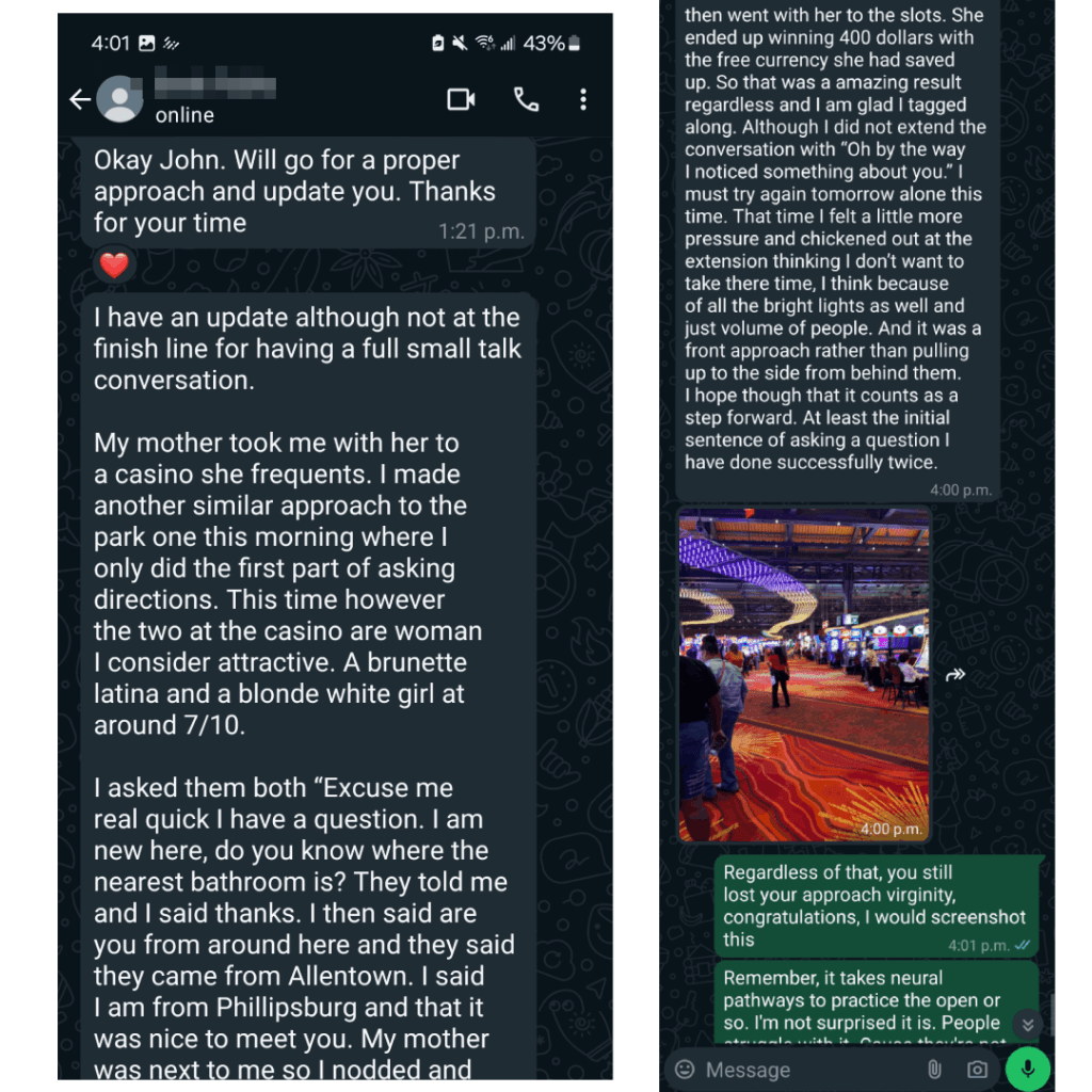 This is a Latino in the United States. This is what he said, “I have an update although not at the finish line for having a full small talk conversation. My mother took me with her to a casino she frequents. I made another similar approach to the park this morning where I only did the first part of asking directions. This time, however, the two at the casino are women I consider attractive—a brunette Latina and a blonde white girl around 7 out of 10. I asked them both ‘Excuse me real quick I have a question. I am new here, do you know where the nearest bathroom is?’ They told me and I said thanks. I then said ‘Are you from around here?’ and they said they came from Allentown. I said ‘I am from Phillipsburg and that it was nice to meet you.'”