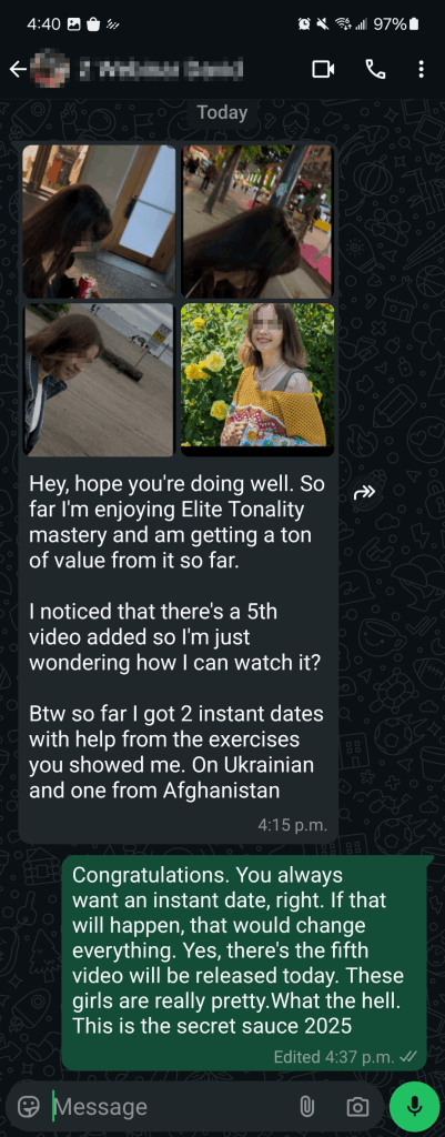✅ He’s had two instant dates—one with a Ukrainian girl and another with a Middle Eastern girl, both extremely cute with very pretty faces.